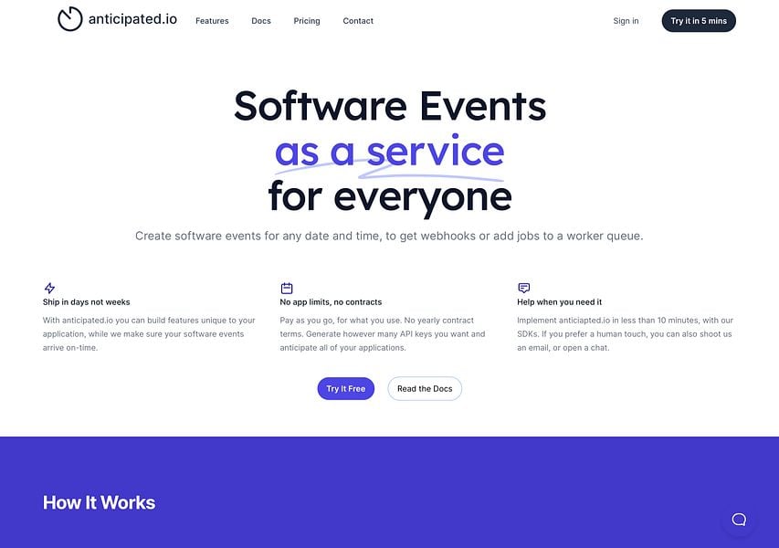 anticipated.io is Software events as a service. Create unique events for your application at specific date/times. Perfect if you need a webhook hit at a specific time in the future, need a queue item created to send a reminder message, or for any event-driven application.