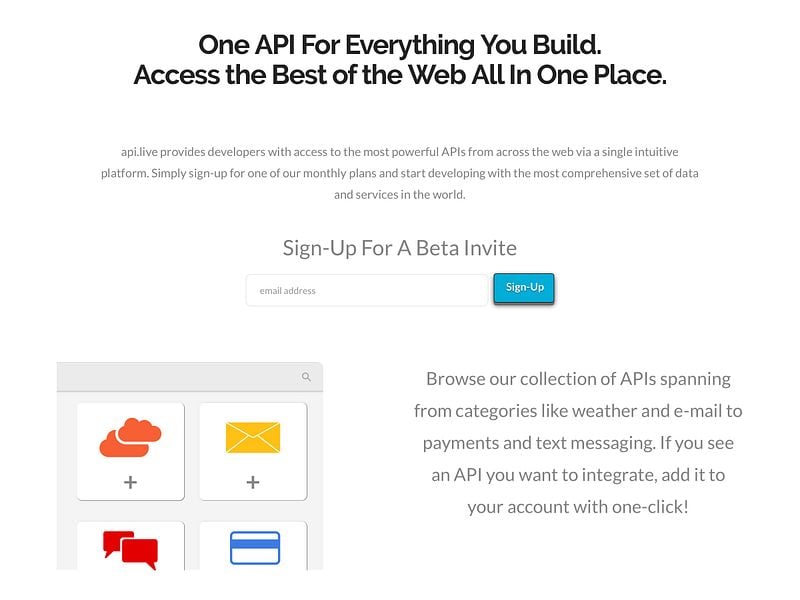api.live is a unified platform for accessing and integrating the world's top APIs. With our platform, developers can sign-up for a single monthly subscription that grants them access to industry leading APIs across nearly every category. Our developer console allows customers to start working with APIs from partners like AccuWeather, Mailjet, Clarifai, and more with just a single click. Developers can then view and manage everything from usage and analytics to billing all in one place, and with a single set of credentials.