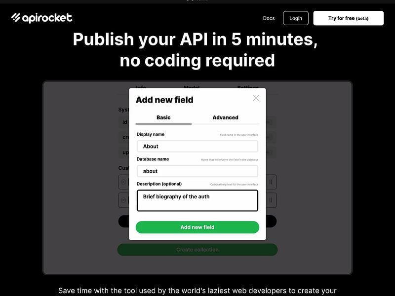 Apirocket, prototype, test and publish your GraphQL API with no-code. Design your data model without writing code from a catalog of predefined types. We have already prepared the queries and mutations you will need.