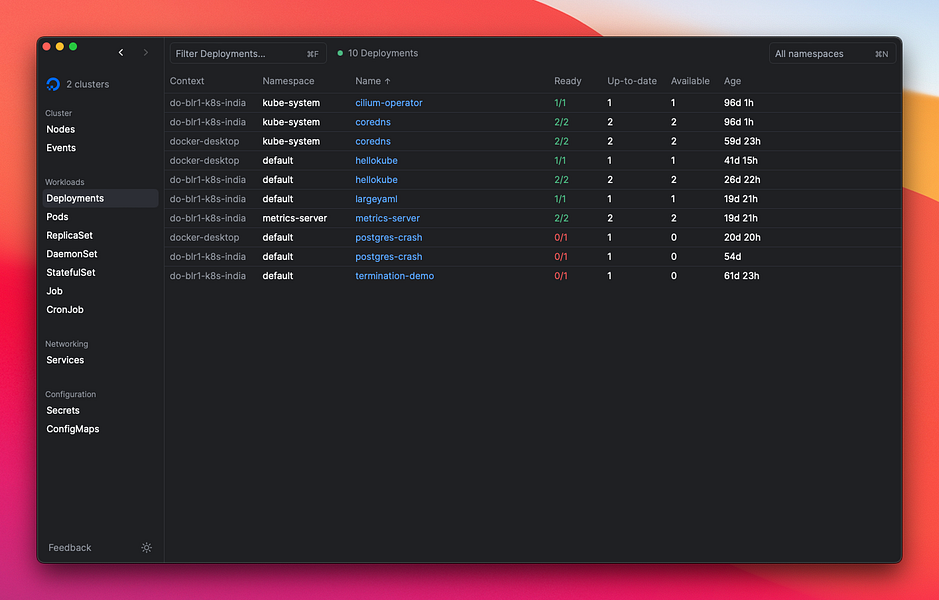 Aptakube is a modern, lightweight and multi-cluster Kubernetes desktop client. Connect to multiple Kubernetes clusters as if it was just one. View and manage Pods, Deployments, ReplicaSets, ConfigMaps and all other resources through a fast, intuitive and easy to use graphical interface. Quickly visualize your pod and node health status, logs and much more. Works on macOS, Windows and Linux.
