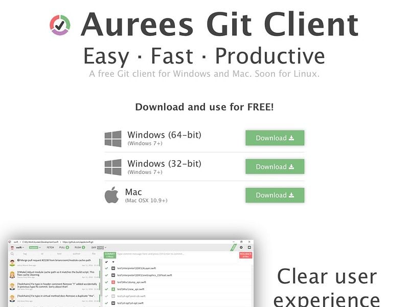 Aurees Git Client is a streamlined git client for viewing, editing and publishing changes from your desktop. An attractive interface and full-fledged integrated diff helping manage Git repositories with minimal effort. No more need to search external diff tools or switch between text editors and git client while working. The client shows commit changes in side by side text editors, where you can see the changes and rollback in a click. Merging is easy with the Aurees Git!