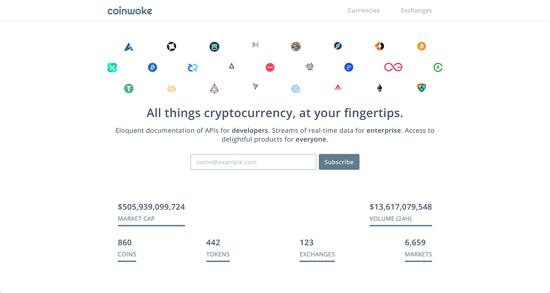 Coinwoke is organizing cryptocurrency data to foster the creation of useful and reliable tools. To do so, we are building a suite of products and services for developers, enterprise, and users to view, analyze, and derive insights from the data.