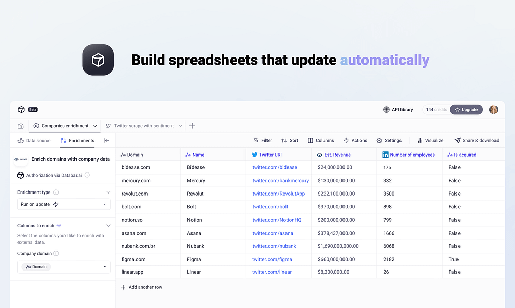 Databar lets you access any data API in under 3 clicks! Enrich your data with 1000+ external data sources, schedule enrichments to run on click or automatically, and requires no technical skills to set up.