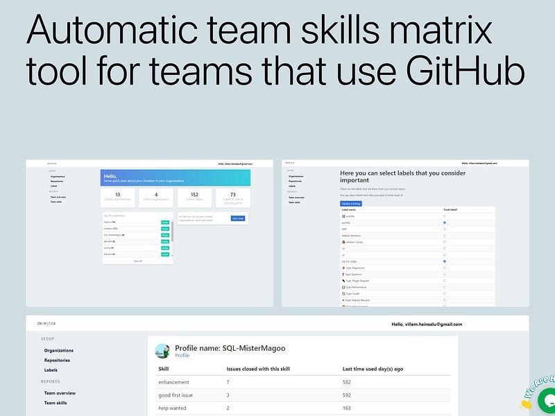 Develytica is a tool that allows teams to get their team members skills map by using Github issues and labels on the issues. It works so that each time a issue is completed we will award the assignee(s) point for each label that is on the issue. This means that you can have up-to-date skills map that never get old.