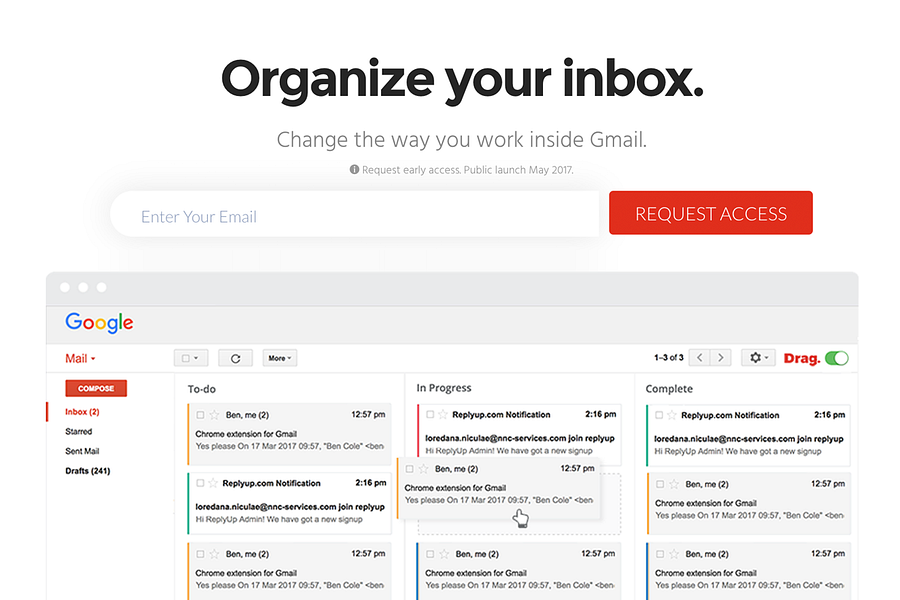 Drag lets you transform your inbox into organized task lists. Sort your emails between pipeline stages (To Do, Doing & Complete) with simple drag ‘n drop, and mark as complete.