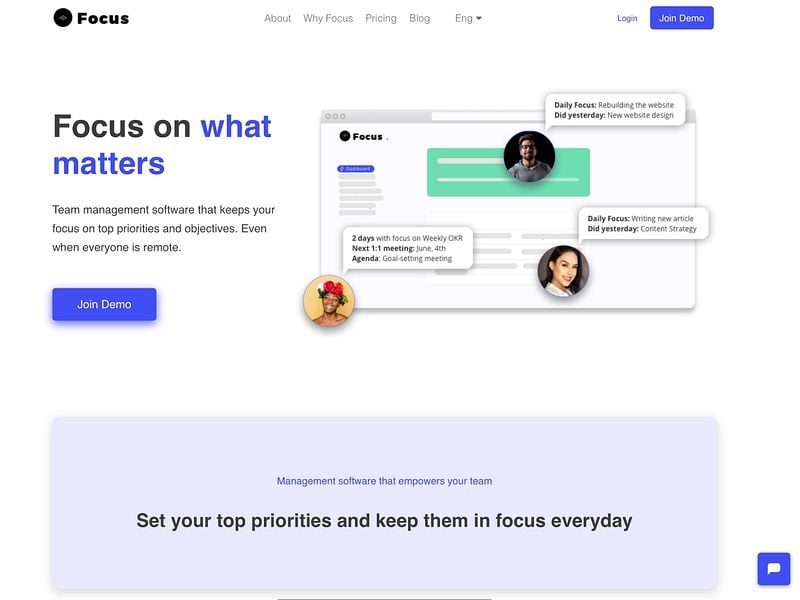 Focus aligns teams and keeps your focus on top priorities and objectives. It's a toolkit with daily check-ins, OKRs, and 1:1s meetings.