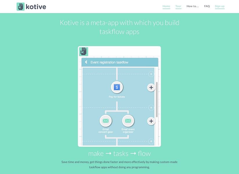 Kotive is a meta-app with which you build taskflow apps for your company and/or your customers. Get things done faster and more effectively by making custom-made taskflow apps without doing any programming.