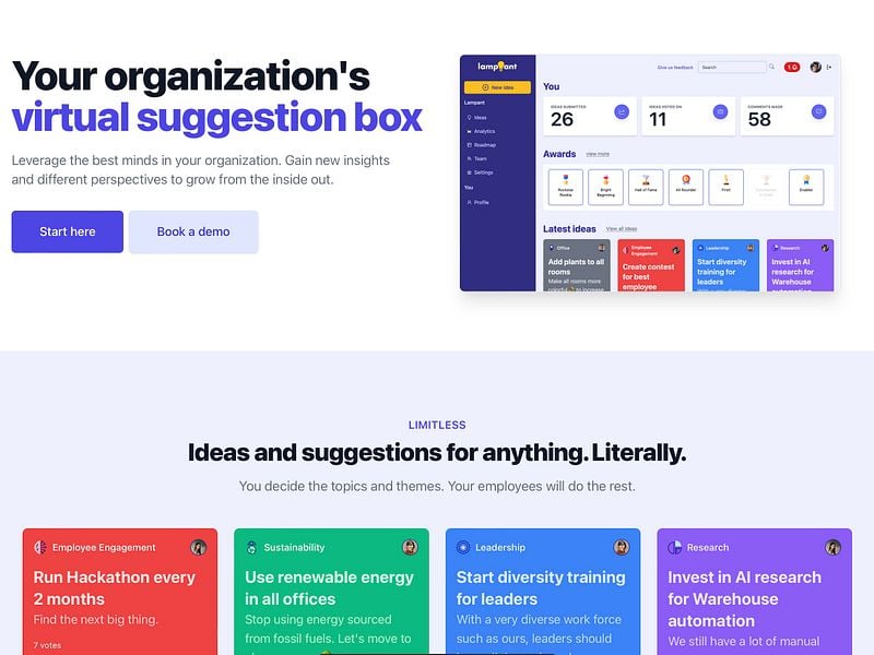 Lampant is the virtual suggestion box for the modern workplace. An innovation platform that allows your organization to find and act on your employees' greatest ideas, ranging from new business opportunities, employee engagement activities or simply how the new office is going to look like.