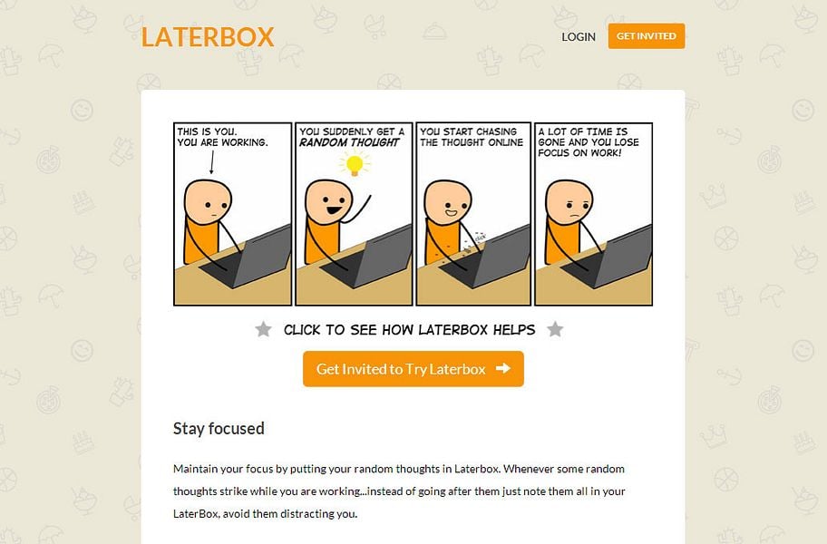 Laterbox helps you maintain your focus while doing work. When a random thought strikes you while you are working you simply note them in your LaterBox, rather than pursuing it right away and letting it distract you.