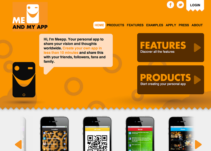 Me and My App is a platform to create your own mobile application. Building apps still requires a lot of expertise and programming skills, with Me and My App no longer. Build an app with your features, data and look and feel in less then 15 minutes. Use it to promote yourself, share with friends, family and followers. Let the world know who you are with your very own mobile app on iOS, Android, Windows Phone 7 and mobile web.
