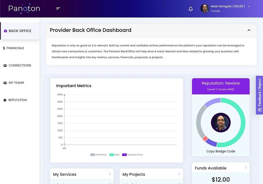 A businesses' reputation & their ability to be referred to others can be a key differentiator in their success. Our goal with the Panoton platform is to provide the market with a 360 view of a businesses' reputation and the ability to create and monetize that reputation through referrals. We leverage existing social media, connections, clients, revenue, references, skills, experience & more to create a current and trusted picture of your personal & professional reputation. Build your company and teams online to leverage and execute on services & projects for your clients and explore how your network can monetize your reputation.