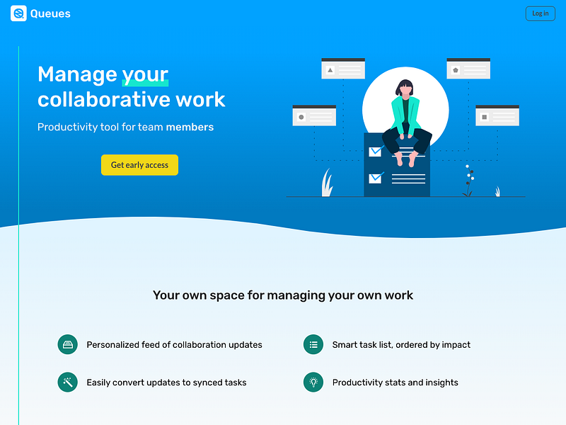 Queues is a productivity tool for team members. It provides you with your own dedicated space for managing your own work, in a pleasant and productive manner.