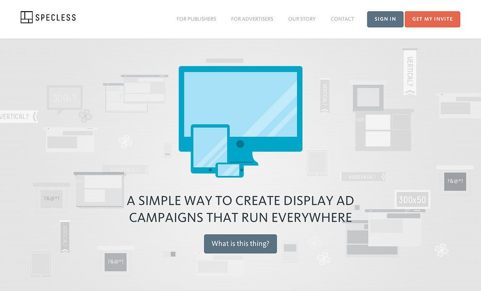 Specless takes the tedium out of multi-device campaigns. Our platform takes your existing ad creative and makes it responsive so it’ll look perfect on every screen. A Specless ad can run in any ad slot on any device with the ad intelligently resizing and optimizing to the device it is being viewed on.