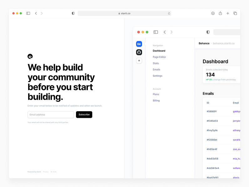 Startt makes it incredibly easy to create a landing page for your upcoming product and start building a mailing list in just seconds.