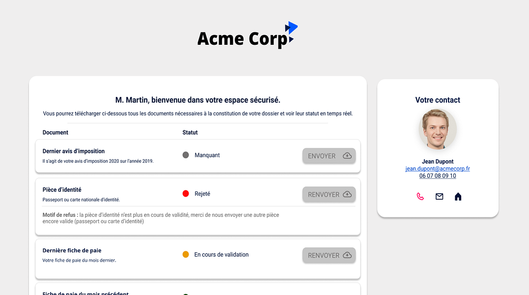 Create your branded platform, request documents from your contacts and follow-up automatically in case a file is missing.