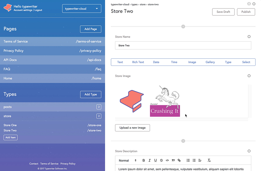 Typewriter Cloud CMS is a headless, API-focused content management system that works with any platform you want to use. Create pages and collections of documents and combine them to build a powerful content provider for your API-driven website or app. Save yourself time, money and the headaches of server maintenance by uncoupling your frontend from your CMS!