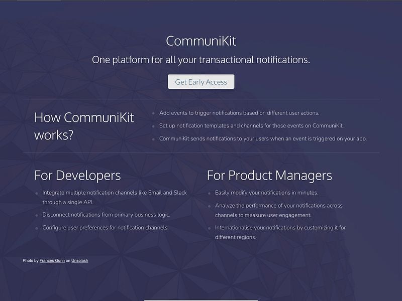 Using CommuniKit, you can - - Integrate multiple notification channels like Email and Slack through a single API. - Disconnect notifications from primary business logic. - Configure user preferences for notification channels without having to store these details in your app. - Customise & deploy notification templates in minutes, without redeploying your app. - Translate and localise content for different regions.