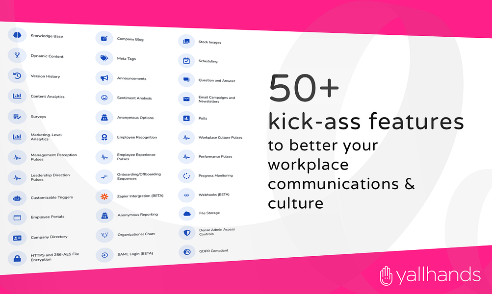 Yallhands betters workplace communications and culture by bundling essential tools and templates into one platform. Launch a stunning employee experience portal and strategy in moments with content, surveys, onboarding, and more -- even if you have no HR experience. Free forever for small teams too!