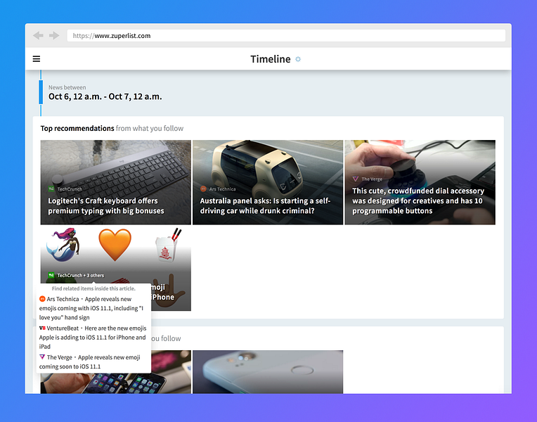 Zuperlist is an RSS News Reader in which you can follow everything published on your favorite sites. What's different is that the news are sorted by how close they are to your interests, not by when they're published.